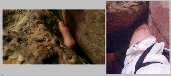 Lefeszíti a karját a szikla oldalára és egyenként eltöri a két karcsontját. Majd beledöfi a pengét a karjába, a gázok itt is feltörnek. Sikerül elvágnia úgy a bőrét, hogy lássa karja belső részeit. Koncentrál, hogy ne adja fel, ne legyen rosszul, ne ájuljon el. Először az izmokat vágja el, felrakja az érszorítót, majd az idegpályához ér. Karja, mintha rotyogó lavinába tenné, olyan fájdalmat produkál. Nincs mese, el kell vágnia az idegeket. Összeszorítja a fogait, és elvágja az idegpályát, farkasüvöltése kilométerekre elhallatszik, de egy ember sem hallja meg. Elvágja az ütőereket és végül az inakkal próbálkozik, de a legerősebb anyaggal van dolga, amivel valaha találkozott és a pengéje inkább csak egy fémlap, úgyhogy nekiszorítja a karját a falnak, és vágódeszkaként használva sikerül az utolsó rabságában tartott szálat is megszakítania.
